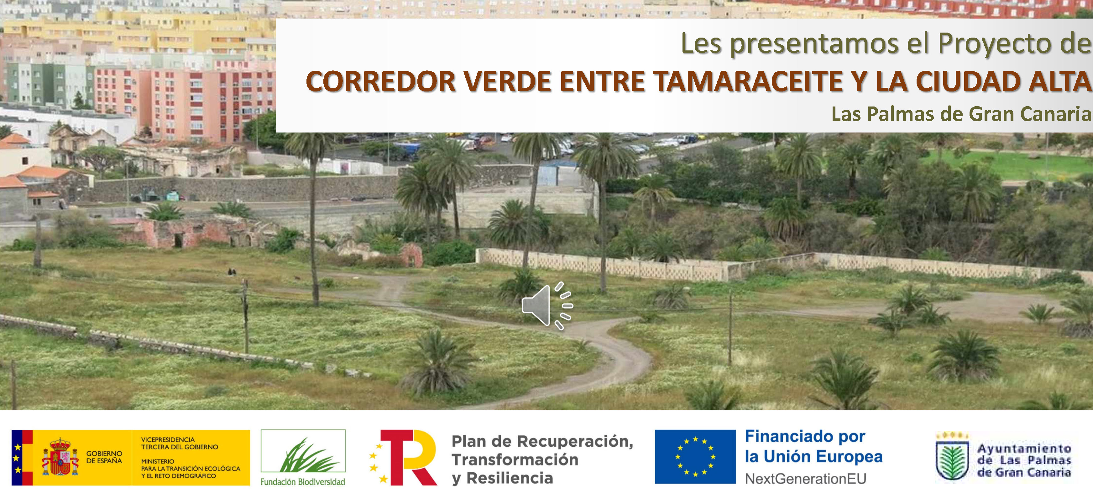 El Proyecto de “Corredor Verde entre Tamaraceite y la Ciudad Alta” es subvencionado por la Fundación Biodiversidad, del Ministerio para la Transición Ecológica y el Reto Demográfico, en desarrollo de la componente asociada a la conservación y regeneración de la biodiversidad en el Plan de Recuperación, Transformación y Resiliencia de España, financiado mediante los fondos Next Generation EU. La solución presentada por el Ayuntamiento de Las Palmas de Gran Canaria y con resolución favorable de concesión es resultado de la convocatoria para el año 2022 que efectuó la referida Fundación Biodiversidad para fomentar actuaciones dirigidas a la renaturalización y resiliencia de las ciudades españolas.