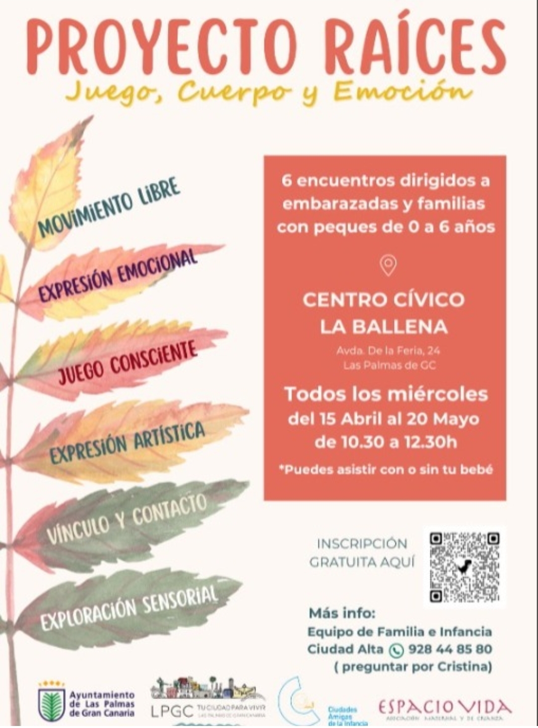 Las Palmas de Gran Canaria, 16 de abril de 2026. El Ayuntamiento de Las Palmas de Gran Canaria, a través de la Concejalía de Bienestar Social, Igualdad, Cuidados y Salud y la Unidad Técnica de Familia e Infancia, avanza con el desarrollo del proyecto ‘Raíces: Juego, Cuerpo y Emoción’, una iniciativa dirigida a embarazadas y familias con niños y niñas de hasta seis años orientada a fortalecer los vínculos afectivos y el bienestar emocional en las primeras etapas de la crianza.