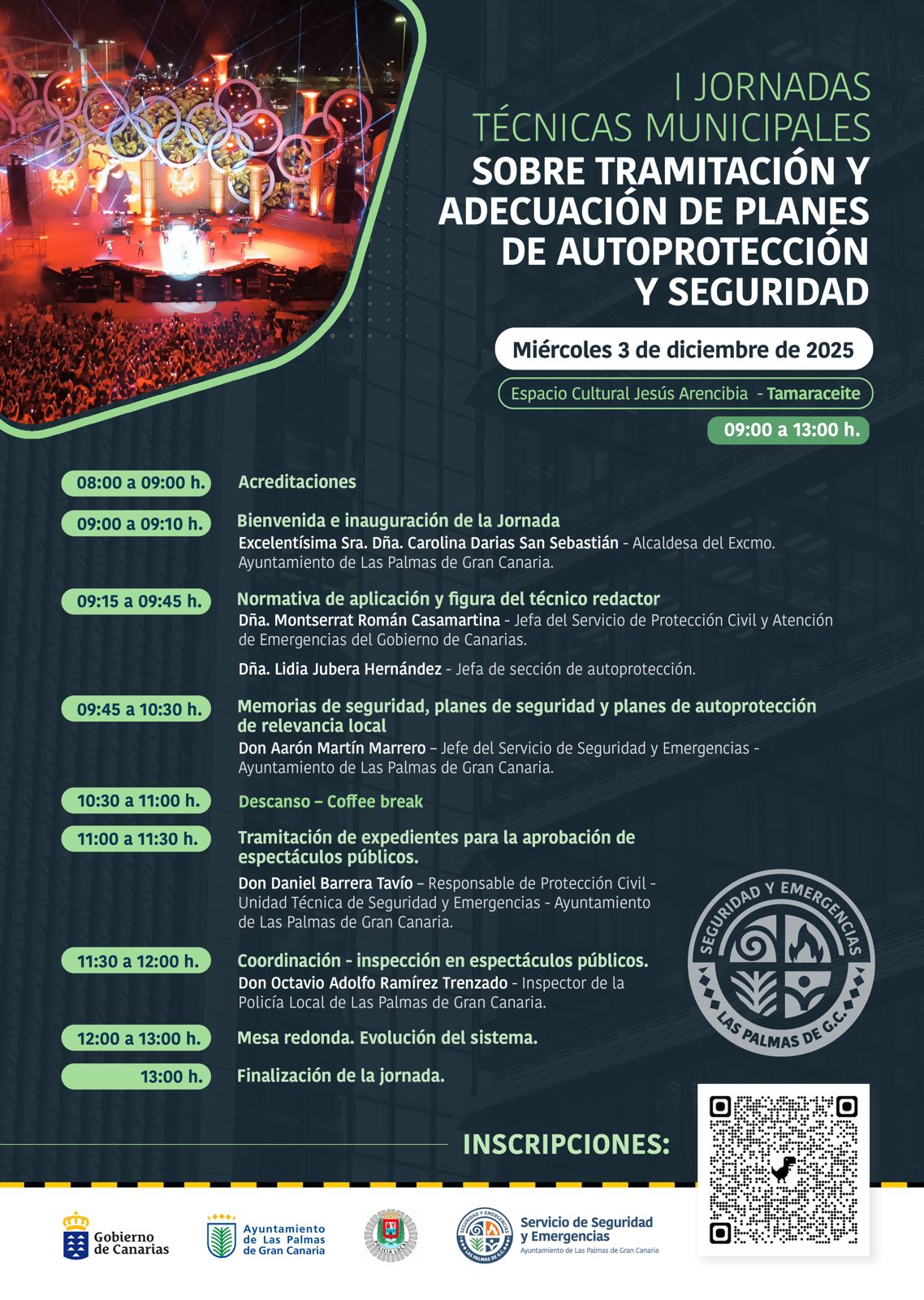 Las Palmas de Gran Canaria, 26 de noviembre de 2025. El Ayuntamiento de Las Palmas de Gran Canaria, a través del Servicio de Seguridad y Emergencias de la Concejalía de Seguridad, celebrará el próximo miércoles 3 de diciembre las ‘I Jornadas Técnicas Municipales sobre tramitación y adecuación de planes de autoprotección y seguridad’, un encuentro profesional que tendrá lugar de 09:00 a 13:00 horas en el Espacio Cultural Jesús Arencibia, en Tamaraceite.