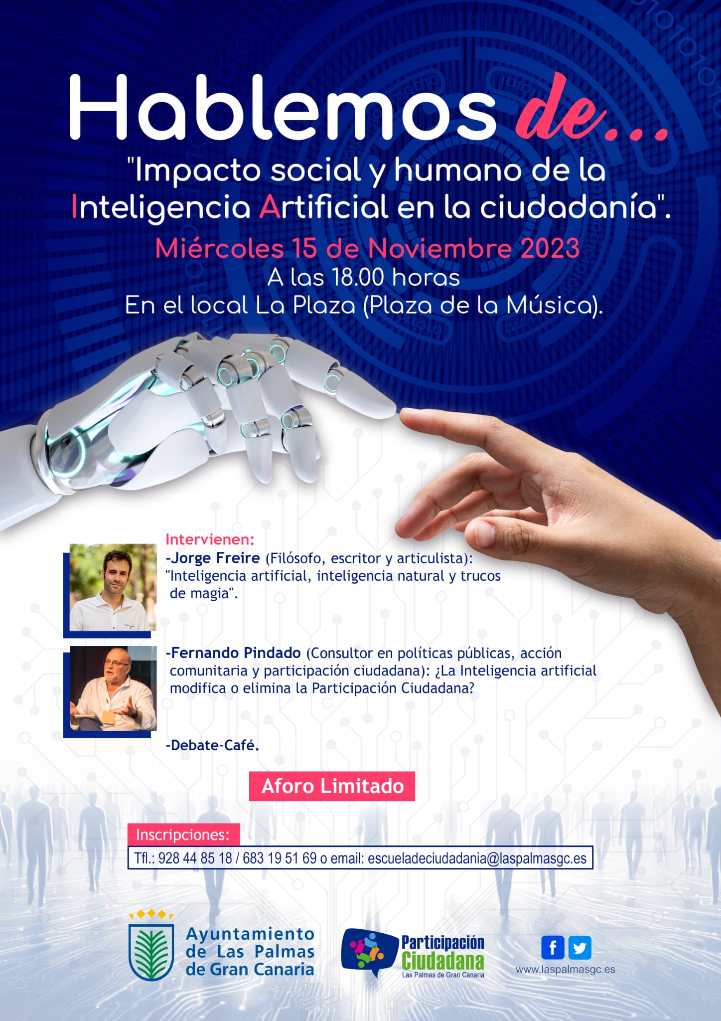 La cita, que se desarrollará en el espacio ‘La Plaza’, local de la Concejalía de Participación Ciudadana situado en la Plaza de la Música de la capital grancanaria, lleva por título ‘Impacto Social y Humano de la Inteligencia Artificial en la Ciudadanía’ y se enmarca en el programa de actividades organizado por la Escuela de Ciudadanía que impulsa la citada concejalía dirigida por Carla Campoamor.