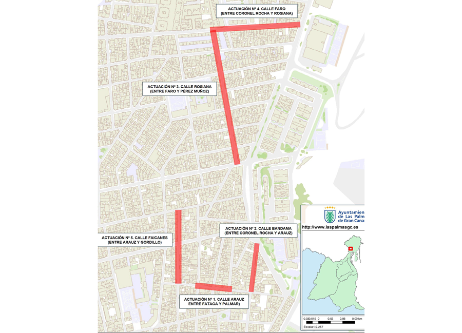 El proyecto contempla la actuación en cinco tramos de las calles Arauz, Bandama, Rosiana, Faro y Faicanes, donde se llevará a cabo la sustitución de colectores y albañales, así como la ejecución y rehabilitación de elementos asociados a la red de saneamiento.