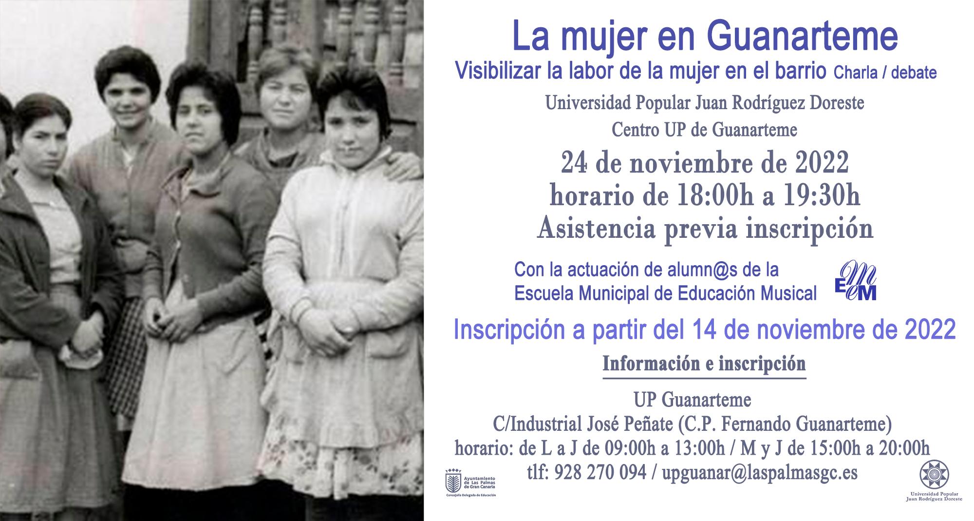 Las Palmas de Gran Canaria, viernes 11 de noviembre de 2022.- El Ayuntamiento de Las Palmas de Gran Canaria, a través de la Universidad Popular (UP) Juan Rodríguez Doreste, dependiente del área de Educación que dirige Lourdes Armas, realizará una charla coloquio ‘La Labor de la Mujer en el Barrio de Guanarteme’ con la que se quiere poner en valor el importante papel de la mujer a lo largo de la historia de este popular barrio de la capital grancanaria.