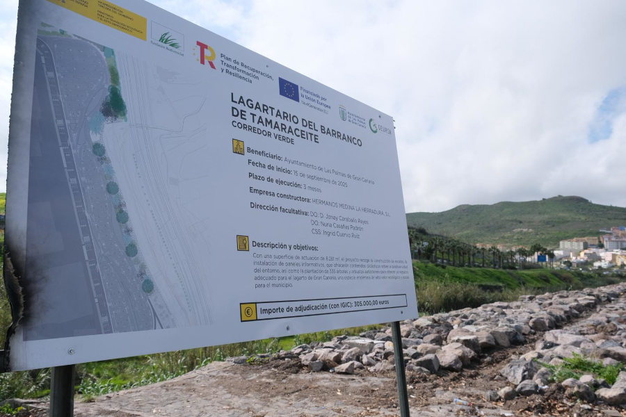 Así, tras culminar en 2025 la redacción del Plan Director de Infraestructura Verde-Azul y Biodiversidad de Las Palmas de Gran Canaria, los trabajos de renaturalización de ‘Ampliación del lagartario de Tamaraceite’, con un importe de 305.000 euros, han permitido intervenir sobre una superficie aproximada de 22.500 metros cuadrados en el cauce del barranco con el objetivo de favorecer la conservación del lagarto de Gran Canaria (‘Gallotia stehlini’), especie endémica protegida.