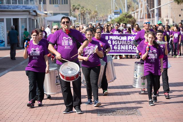 El evento, en el que han participado más de 200 de personas que se habían registrado previamente en una lista de inscritos, y que ha recorrido el paseo de Las Canteras desde el auditorio Alfredo Kraus hasta la Plaza de Saulo Torón, forma parte del programa de actividades que ha diseñado el área de Igualdad con motivo de la celebración del Día de la Mujer. Una vez ha finalizado la marcha, se ha procedido a la lectura de un manifiesto que reclama una igualdad de derechos y oportunidades entre hombres y mujeres en la sociedad, ha tenido lugar el taller 'Chapas por la Igualdad', así como la actuación del grupo musical 'Última Llave'.