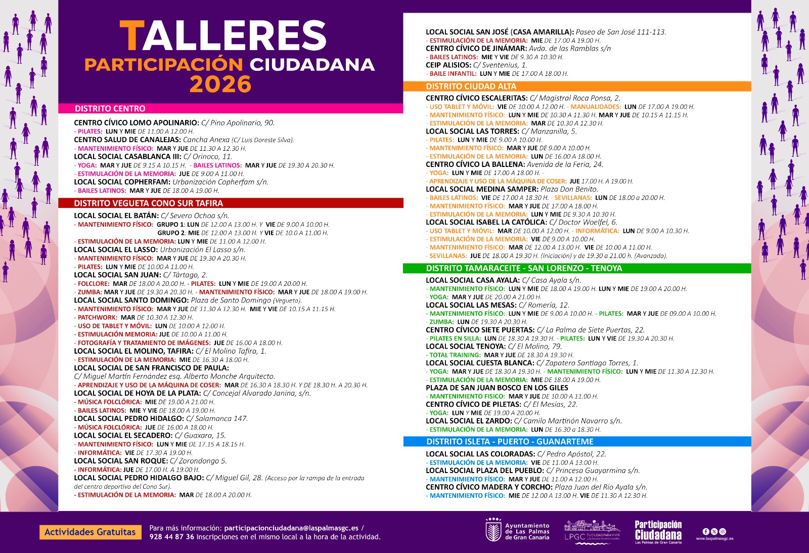 Las actividades son de carácter gratuito y las personas interesadas pueden obtener más información y realizar su inscripción a través del correo participacionciudadana@laspalmasgc.es o del teléfono 928 44 87 36, así como directamente en los centros cívicos y locales sociales donde se desarrollan los talleres.