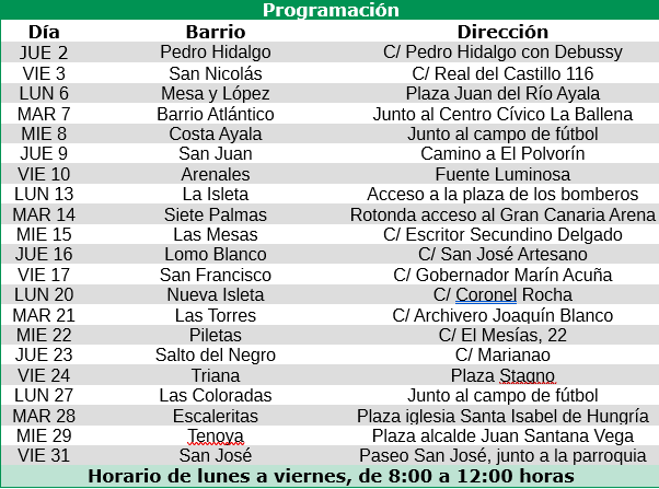 El dispositivo ha estado instalado durante este mes de abril en los barrios de Jinámar, Casablanca III, La Isleta, Schamann, Lomo los Frailes, Zárate, La Paterna, Guanarteme, Polígono Cruz de Piedra, San Lorenzo, Tres Palmas / Hoya de la Plata, Alcaravaneras, Puerto, El Polvorín, Almatriche, Vega de San José, Los Tarahales, La Minilla y El Pilar.